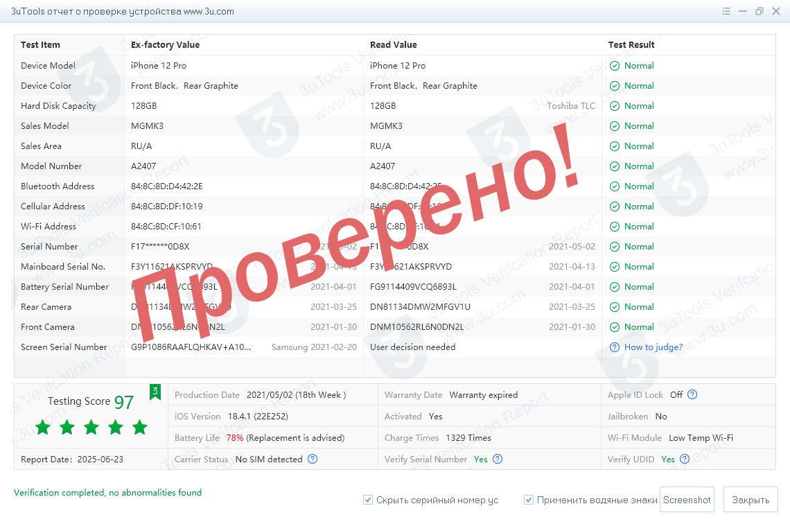 - ✅ Совпадают ли IMEI и серийник на устройстве, коробке и в меню.