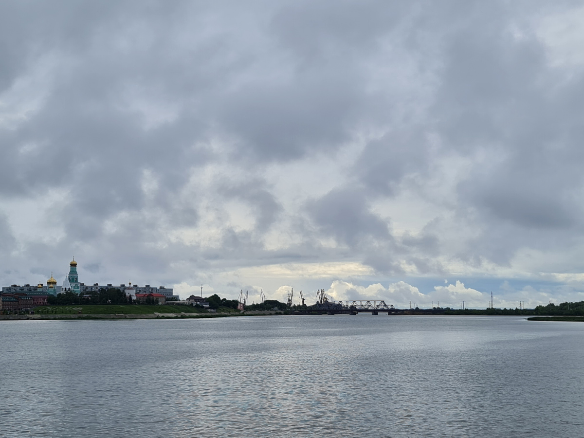 Справа река Сызранка, серая тихая, мягко несущая свои воды в Волгу. Вдали виден железнодорожный мост, Кремль и красивая понорама на центр города. И слышны колокола Казанского собора.