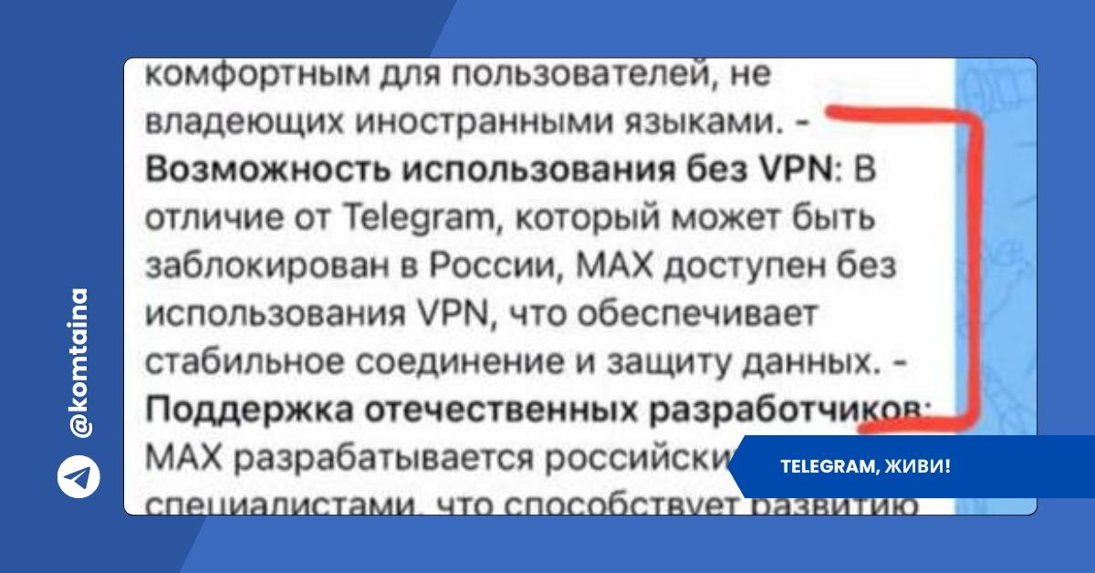 ΠΊΠΎΠ½ΠΊΡΡΠ΅Π½ΡΠΎΠ². Π ΡΠ΅ΠΊΠ»Π°ΠΌΠ½ΠΎΠΉ ΠΊΠ°ΠΌΠΏΠ°Π½ΠΈΠΈ ΠΌΠ΅ΡΡΠ΅Π½Π΄ΠΆΠ΅ΡΠ° MAX, ΡΠΎΠ·Π΄Π°Π½Π½ΠΎΠ³ΠΎ ΠΏΡΠΈ ΠΏΠΎΠ΄Π΄Π΅ΡΠΆΠΊΠ΅ Π³ΠΎΡΡΠ΄Π°ΡΡΡΠ²Π°, ΠΏΠΎΡΠ²ΠΈΠ»Π°ΡΡ ΡΡΡΠΎΠΊΠ°, ΠΊΠΎΡΠΎΡΠ°Ρ ΠΏΡΠΎΠ·Π²ΡΡΠ°Π»Π° ΠΊΠ°ΠΊ ΠΎΡΠΊΡΡΡΠ°Ρ ΡΠ³ΡΠΎΠ·Π°: Β«Π ΠΎΡΠ»ΠΈΡΠΈΠ΅ ΠΎΡ Telegram, ΠΊΠΎΡΠΎΡΡΠΉ ΠΌΠΎΠΆΠ΅Ρ Π±ΡΡΡ Π·Π°Π±Π»ΠΎΠΊΠΈΡΠΎΠ²Π°Π½ Π² Π ΠΎΡΡΠΈΠΈ, MAX Π΄ΠΎΡΡΡΠΏΠ΅Π½ Π±Π΅Π· ΠΈΡΠΏΠΎΠ»ΡΠ·ΠΎΠ²Π°Π½ΠΈΡ VPNΒ». ΠΡΠΎ ΡΠΆΠ΅ Π΄Π°Π»Π΅ΠΊΠΎ Π½Π΅ Π½Π°ΠΌΡΠΊ. Π Π°Π·ΡΠ°Π±ΠΎΡΡΠΈΠΊΠΈ MAX, ΠΏΠΎ ΡΡΡΠΈ, ΠΎΠ·Π²ΡΡΠΈΠ»ΠΈ ΡΠΎ, ΡΡΠΎ ΡΠ°Π½ΡΡΠ΅ ΠΎΠ±ΡΡΠΆΠ΄Π°Π»ΠΎΡΡ ΡΠΎΠ»ΡΠΊΠΎ Π½Π° ΡΡΠΎΠ²Π½ΡΡ