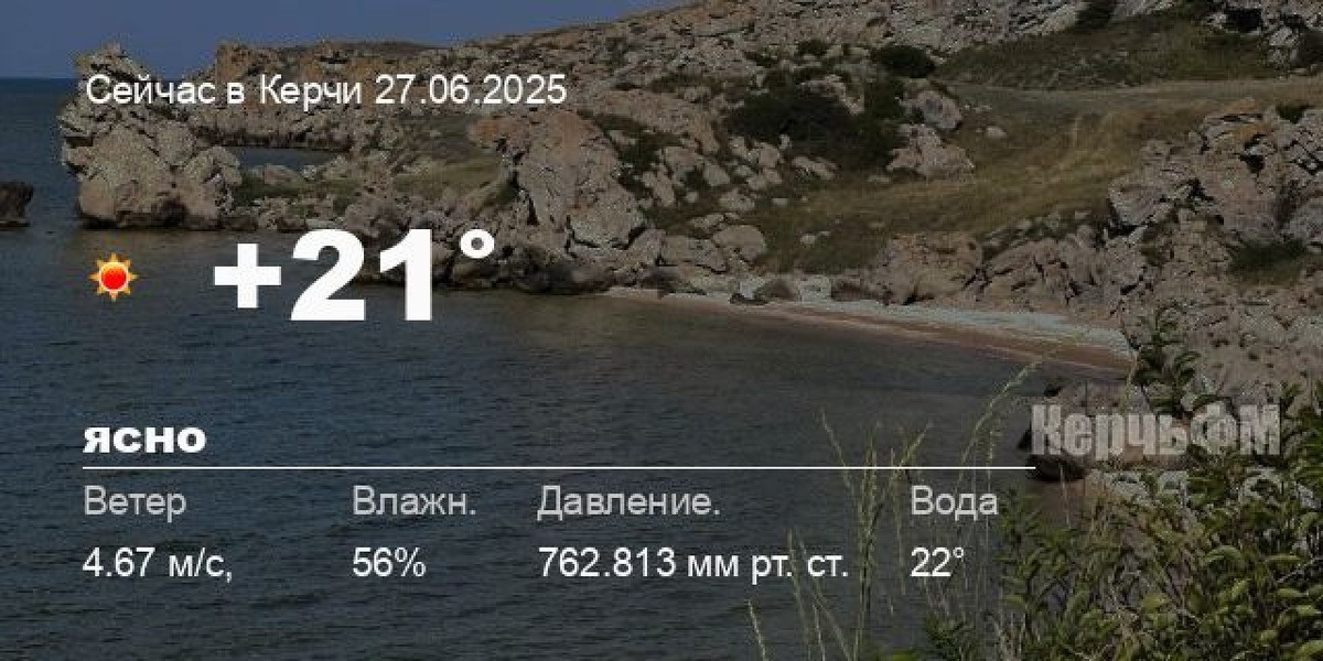 Погода в Керчи 27 июня Сегодня днем в Керчи, 27 июня, ожидается ясная погода, температура воздуха от +19.8° до +22.8°С, ветер 4.22 м/с, порывы до 5.21 м/с, давление 762.1 мм рт. ст., влажность 47%. Ближайшей ночью ожидается ясная погода, температура +20°С. Завтра, 28 июня, в течение суток ожидается пасмурная погода; ночью +20°С, днем +21.3°С, ветер северный 1.01 м/с. - Феодосия от +18.5° до +24.9°С, 🌞 ясно, море: 18°C - Судак от +16.5° до +22.3°С, 🌞 ясно, море: 19°C - Симферополь от +16.4° до +28... подробнее Подписывайся на КерчьФМ.РФ @kerchfm