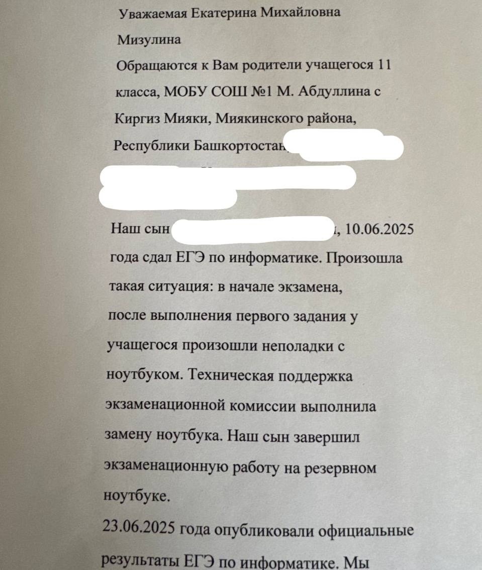 В селе Киргиз-Мияки во время сдачи ЕГЭ по информатике произошёл технический сбой. В школе № 1 у одного из выпускников после выполнения первого задания перестал работать ноутбук. Организаторы оперативно заменили устройство, и школьник продолжил экзамен на резервном компьютере. Однако после завершения испытания его результаты не удалось передать в Региональный центр обработки информации — данные не были отправлены ни с первого, ни со второго устройства. Министр просвещения Башкирии Ильдар Мавлетбердин сообщил, что взял ситуацию на личный контроль. В настоящее время проводится проверка всех обстоятельств случившегося. Источник: ИА Башинформ Фото:telegram-канал Екатерины Мизулиной