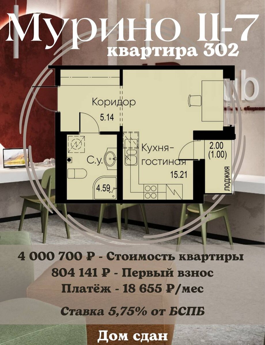 Семейная ипотека с БСПБ 👍 iD Murino II, к.7, студия №302 (25.94 м²) ✍️fix стоимость м² - 155 000 ₽ Условия ипотеки: ⭐️Программа: Семейная ипотека ⭐️Банк: Санкт-Петербург ⭐️Ставка: 5,75% ⭐️Первый взнос от 20,1% По всем вопросам звоните : +79667578789 Михаил