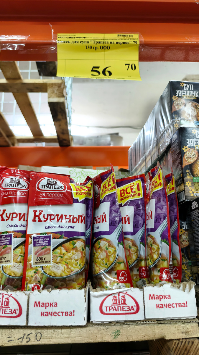 Всем привет! Сегодня буду пробовать куриный супчик бренда "Трапеза на первое", купленный в любимом Светофоре. 56,7 рублей. Даже дешевле Доширака. 8 порций, 2 литра супа на выходе. Для меня это три порции. Всё включено! Всё, да не всё. 600 граммов курицы вынь, да положь. Хаха, 100 минут на приготовление. Можно с голода умереть за это время. В Светофоре был только куриный суп. Но у них ещё много различных вариаций. Наиболее интересна мне была смесь для ухи. Изготовитель: ООО "Новосибирский пищевой комбинат", Новосибирская область. В составе макароны, сушеные овощи, зелень и специи, и морская соль. Вот суп называется куриный. А курицы нету. Если не добавить курицу, то он будет просто макаронный. А курицу ещё где-то добыть нужно. Подробный рецепт приготовления присутствует. Буду его придерживаться. Суп будет вкуснее с хрустящим французским багетом. Конечно, с ним всё будет вкуснее. Только где его взять? Поставил варить бульон из куриной спины и пары крыльев. Пока варился буль