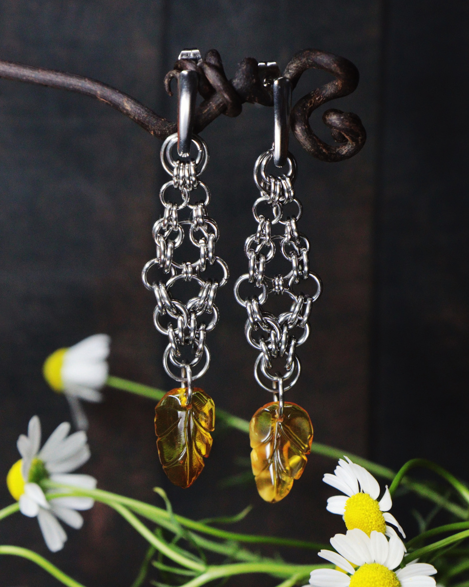 Что-то действительно необычное для солнечных летних дней! Серьги сделаны полностью из нержавеющей стали в технике кольчужного плетения. Они приятно струятся и покачиваются при каждом движении, привлекая внимание к красоте вашей изящной шеи. Удобные застежки в виде пусетов надежно фиксируют серьги, и при этом не делают их слишком тяжелыми - вес одной сережки 3.7г, что очень неплохо для такой длины и размера. Длина вместе с застежкой и янтарным листиком около 68мм, ширина 14мм. Янтарь медового теплого оттенка чудесно сияет на солнце и выглядит особенно ярко на фоне сдержанного блеска нержавеющей стали. Листики из янтаря не совсем одинаковые - один более прозрачный, во втором есть светлые включения, размер и форма также немного отличаются. Янтарь считается одним из самых солнечных и живых камней, хотя камнем его