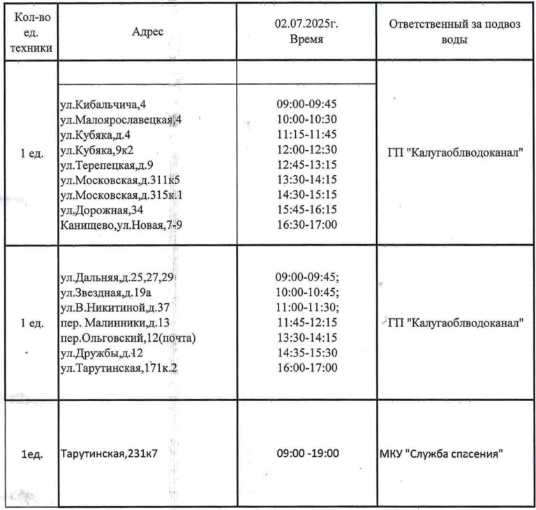 С 9:00 до 17:00 в связи с плановыми ремонтными работами в некоторых районах города будет наблюдаться пониженное давление или полное отсутствие холодной воды: мкрн. Северный, мкрн. Кубяка, мкрн. Байконур, мкрн. Канищево, мкрн. Терепец, д. Лихун, д. Швейцарская, ул. Тарутинская (часть), пер. Сельский, ул. Яновских, ул. Михайловская, ул. Сретенская, ул. Дальняя, ул. Светлая, ул. Терепецкая, мкрн. Малиновка, мкрн. Ольговка, мкрн. Малинники. Особенно продолжительные работы затронут микрорайон Малиновка - здесь водоснабжение восстановится только к 22:00. График подвоза воды 2 июля: После завершения ремонтных работ возможно кратковременное ухудшение качества воды.
