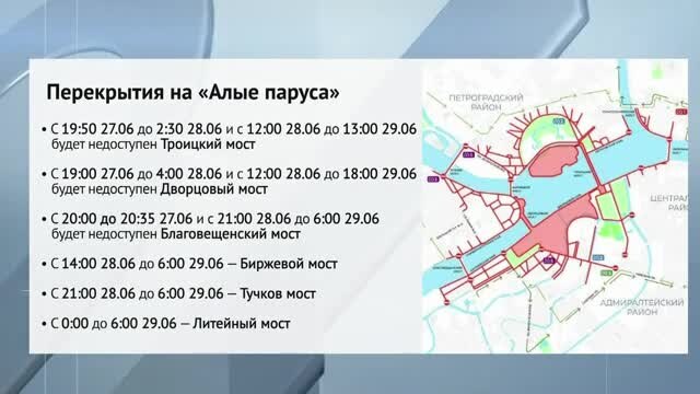 Праздник пройдёт 28 июня, но перекрытия начнутся раньше. Троицкий мост будет недоступен с 19:50 27 июня до 2:30 28 июня и с 12:00 28 июня до 13:00 29 июня. Дворцовый мост — с 19:00 27 июня до 4:00 28 июня и с 12:00 28 июня до 18:00 29 июня. Благовещенский мост перекроют с 20:00 до 20:35 27 июня и с 21:00 28 июня до 6:00 29 июня. Также 28 июня лучше не рассчитывать на проезд по Биржевому, Тучкову и Литейному мостам.
