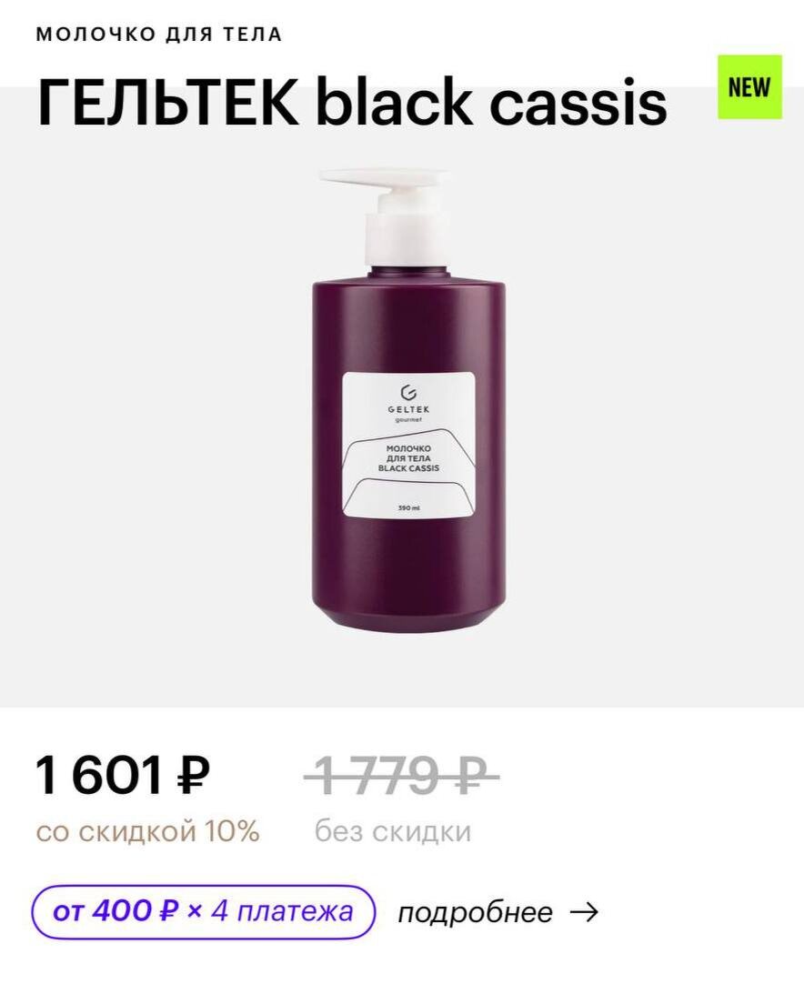 Бесплатные дни отменяются! Гельтек выкатил новинку: молочко для тела с тем самым ароматом черной смородины. Кто со мной давно, знают, что я фанат их масла для душа со смородиной. Оно пахнет как свежесорванные листики смородины у бабушки в огороде. Теперь мне так интересно, как же пахнет молочко. Уже заказано, завтра отчитаюсь 😅