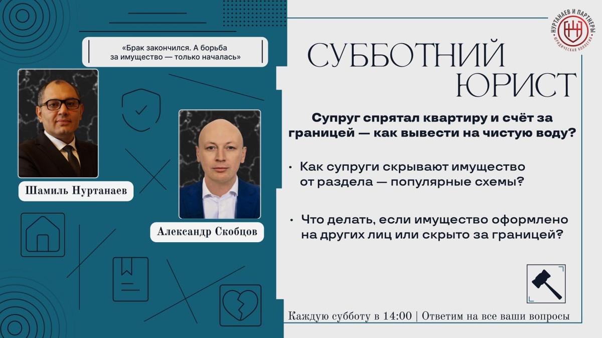 ⚡️⚡️⚡️⚡️Супруг спрятал квартиру и счёт за границей — как вывести на чистую воду? Об этом и о многих других вопросах мы поговорим завтра 28 июня на очередной трансляции "Субботнего Юриста" ⚖️ Эфир проведет юрист с более, чем 20 летней практикой – Шамиль Нуртанаев (нажав на имя вы можете узнать о юристе больше). В эфире примет участие Скобцов Александр Викторович — адвокат с 20-летним стажем, Советник юстиции 3 класса, член Адвокатской палаты Московской области. Специализируется на семейных, наследственных, уголовных и военных делах. Ранее работал помощником федерального судьи, сейчас ведёт собственную адвокатскую практику. Тема эфира: «Скрытое имущество при разводе» 📝 Вот основные вопросы, которые мы обсудим в эфире: 1. Как супруги скрывают имущество от раздела — популярные схемы? 2. Что делать, если имущество оформлено на других лиц или скрыто за границей? Также, каждый может задать свой вопрос любым удобным для вас способом, перейдя по ссылке: https://clck.ru/3ByDxh Или же про