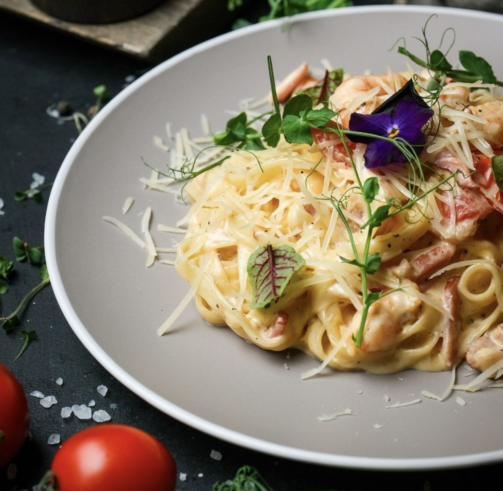 Когда хочется чего-то одновременно уютного и чуть-чуть роскошного, я готовлю эту пасту. Тальятелле с креветками и беконом под сливочным соусом — звучит как ресторанное блюдо, а готовится проще, чем кажется. Идеально для неспешного ужина с бокалом вина или просто чтобы порадовать себя после долгого дня. Решил поделиться рецептом. Ингредиенты на 1 порцию: Креветки — 50 г Бекон — 50 г Сливки 22% — 70 г Плавленый сыр — 30 г Тальятелле или спагетти (уже отваренные) — 150 г Масло растительное или оливковое — 20 г Чеснок — 1 зубчик Помидоры черри — 40 г Пармезан или другой твёрдый сыр — 10 г Подготовка: Креветки очищаем от панциря, убираем кишечную вену (да, та самая чёрная ниточка) и нарезаем крупным кубиком. Бекон тоже режем — можно кубиком, можно соломкой, как нравится. Чеснок мелко рубим, черри моем и режем пополам или на четвертинки — зависит от их размера. Пармезан натираем на мелкой тёрке. Совет: не давите на сыр — получится воздушно, и он быстрее расплавится от жара пасты. Тальят