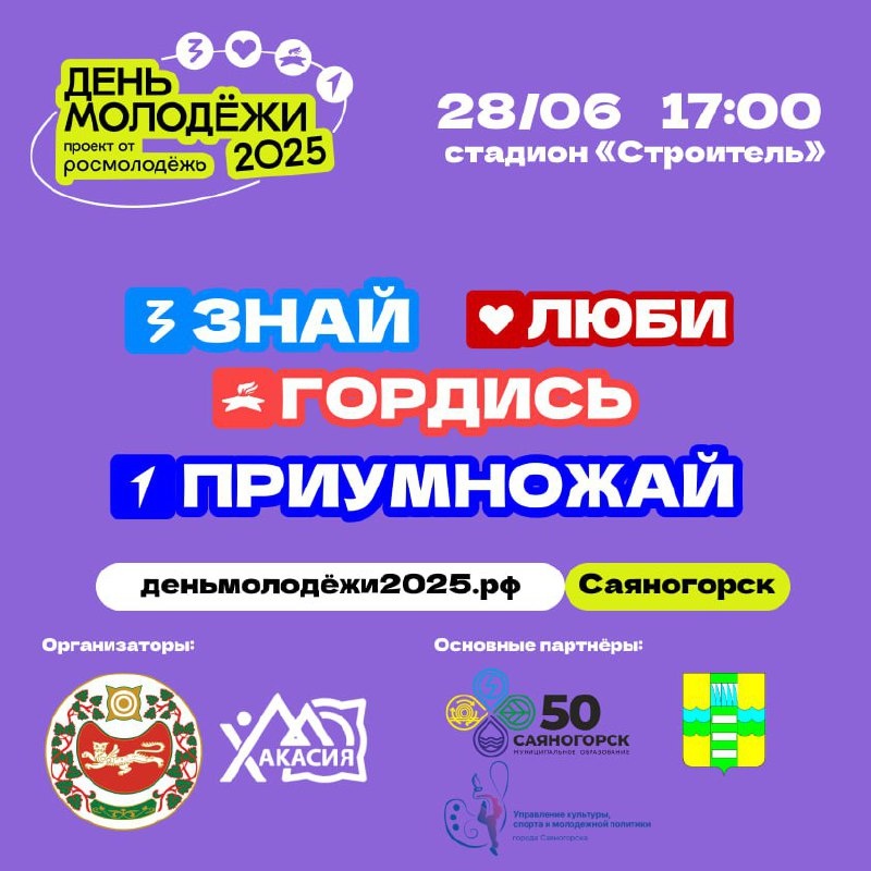 #Главное_праздник Минмолодёжи Хакасии приглашает на фестиваль в честь праздника «День молодёжи-2025» состоится в Саяногорске 28 июня в 17:00 на стадионе «Строитель» 📌 Для гостей будут работать интерактивные площадки и мастер-классы. Во время фестиваля будут проходить активности и розыгрыши призов от партнеров. Торжественное открытие мероприятия в 18:00. Завершится вечер праздничным концертом с отличной музыкой и атмосферой единства! 🌟 Посещение мероприятия бесплатное, но важно зарегистрироваться и получить электронный билет на сайте. 🖼Хакасия. Главное здесь