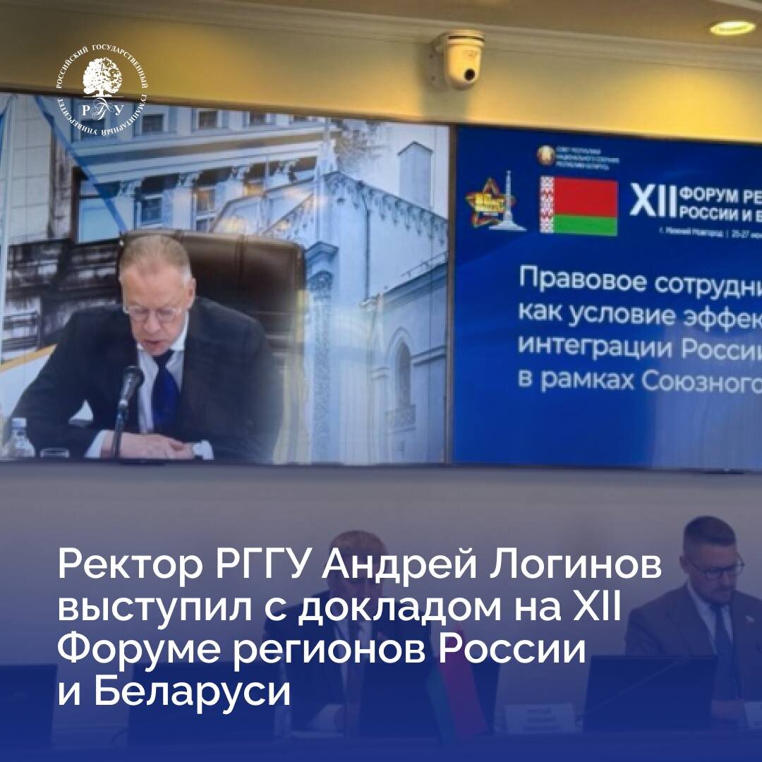 📢 Ректор РГГУ Андрей Логинов выступил с докладом на XII Форуме регионов России и Беларуси, который прошел вчера в Законодательном Собрании Нижегородской области. В мероприятии приняли участие 60 человек: представители стран СНГ, органов власти и научных организаций. 📍 Свою речь Андрей Викторович посвятил вопросам развития гуманитарного образования и науки в Союзном государстве: ⏩ Именно гуманитарное образование и наука способны дать действенный ответ на современные угрозы и вызовы. ⏩ Гармонизация законодательства в части организационно-правовых и финансовых моделей образовательных процессов, стандартов преподавания и оценки освоения образовательных программ признается экспертным сообществом актуальной и важной задачей, но при этом непростой для решения. ⏩ Гуманитаристика является важнейшим цементирующим звеном формирования единого гуманитарного пространства Союзного государства. ⏩ РГГУ готов как к дальнейшему развитию уже существующих проектов и инициатив, так и к разработке и р