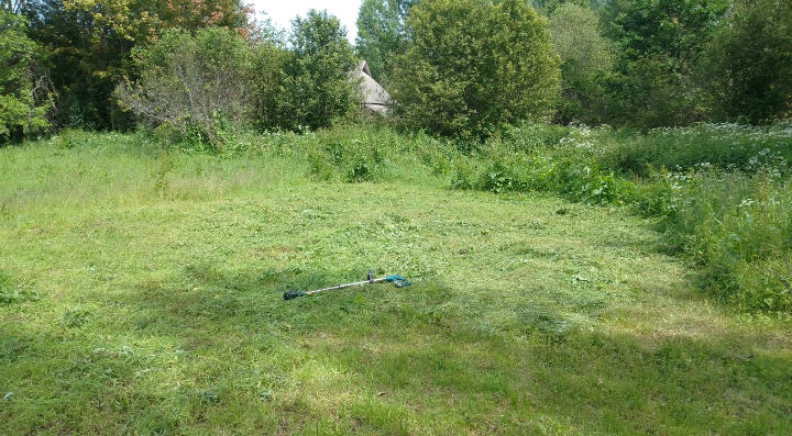 Одни: "Слабенький он". Другие: "У него захват маленький!" Третьи: "Надо подумать..." Я: беру его, и рублю в капусту полсотки крапивы и конского щавеля вперемешку с вьюнком, некогда думать - срочно нужна трава для грядок. С нынешней погодой получается, что каждый погожий день я кошу, и травы всё равно не хватает - теперь потому, что мало погожих дней. Давно пора подкинуть травы бахче, действительно - срочно, потому что некоторые тыквы готовы вытянуться, и тогда траву будет не запихать между листьями. Лидирует пока Халва - и по всхожести, и по темпам роста. Три рядка слева - это как раз она, невооружённым взглядом видно, что она активнее других. А вот триамбл невооружённым взглядом не видно - он явно не в восторге от климата. Цукини уже нежатся в обновлённом тёплом гнёздышке. А второй кабачковой грядке тоже срочно нужна новая трава. И огурцам не помешает, хотя они пока отказываются расти ввысь - междоузлия очень короткие, и на каждом - бутончики. Как они в таком виде собираются свои