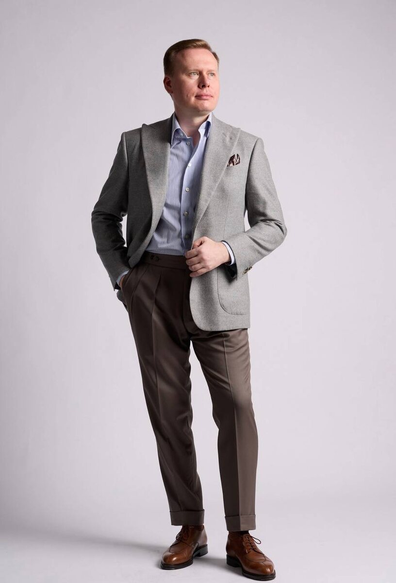 Игра фактур может быть интересным решением при составление образа из верха и низа из близких оттенков одного цвета! Очень часто можно наблюдать ошибку, когда молодой человек надевает пиджак определенного цвета и старается подобрать явно непарные, но близкие по фактуре и цвету брюки. При этом все равно очевидно , что это два разных изделия, и в итоге получается какой-то недокостюм. В моем случае присутствуют светло-серый пиджак с остроконечными лацканами, ткать которого (Loro Piana, коллекция Zelander) имеет легкий ворс и выраженное диагональное плетение. Сама ткань похожа на фланель, хотя ею не является. Брюки более темного серого оттенка выполнены из гладкой костюмной французской ткани Dormeuil. Здесь нет попытки составить костюм там, где его и не нужно составлять! Однако контраст фактур - бархатистый и гладкий - выглядит достаточно интересно.