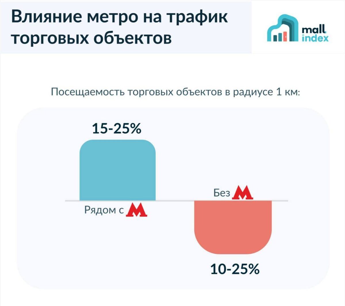 🚇Как метро влияет на посещаемость и бизнес вокруг ✔️Работающая станция метро рядом с ТЦ, кафе или магазином существенно увеличивает поток клиентов — как за счёт транзитного трафика, так и за счёт формирования привычных маршрутов ❌ При закрытии станции: • посещаемость ближайших объектов падает на 10–25% • оборот снижается • страдают арендаторы с ежедневной покупательской активностью 📈 При открытии новых или реконструированных станций: • трафик в радиусе до 1 км может вырасти на 15–25% • бизнес вблизи получает импульс роста • активируются арендаторы, особенно из сегмента услуг и общепита ➡ Транспортная доступность — один из ключевых факторов, влияющих на Mall Index, устойчивость арендаторов и оборачиваемость площадей