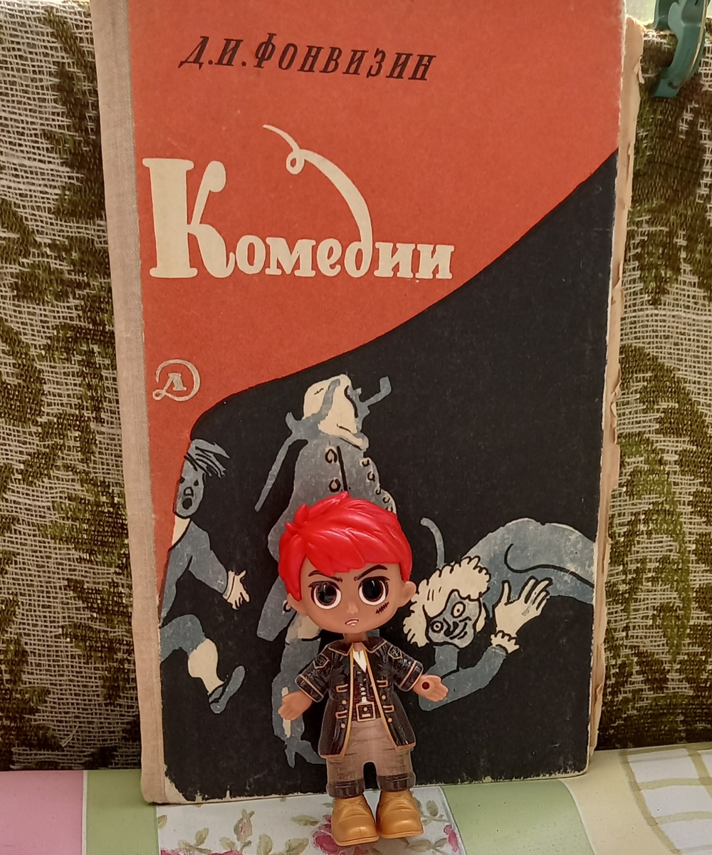 Ура! Ура! Ура! Мой фотопроект "Литературные куклы" снова здесь. Напомню, что на каждом фото проекта - книга и кукла, изображающая героя этой книги. Цели проекта - вызвать интерес к старым добрым бумажным книгам. А ещё вспомнить любимые книги моего детства и юности и книги, которые читали мои родители, когда они сами были ещё маленькими или когда им было столько же лет, сколько мне сей А также поведать моим подписчикам и просто посетителям этой странички о книгах, которые они, возможно, ещё не читали. И напомнить им о книгах, которые они читали в школьные годы. На сегодняшнем фото проекта - русская классика. А точнее - сборник комедий Дениса Ивановича Фонвизина. Он был напечатан в московском издательстве "Детская литература" в 1966 г. Эту книгу подарили моей маме. В неё входят такие произведения, как "Бригадир", "Всеобщая придворная грамматика". И, конечно же, нетленный "Недоросль". А зелёный узорный фон выбран мной для этого фото не случайно: он похож на занавес в театре. Многие ф