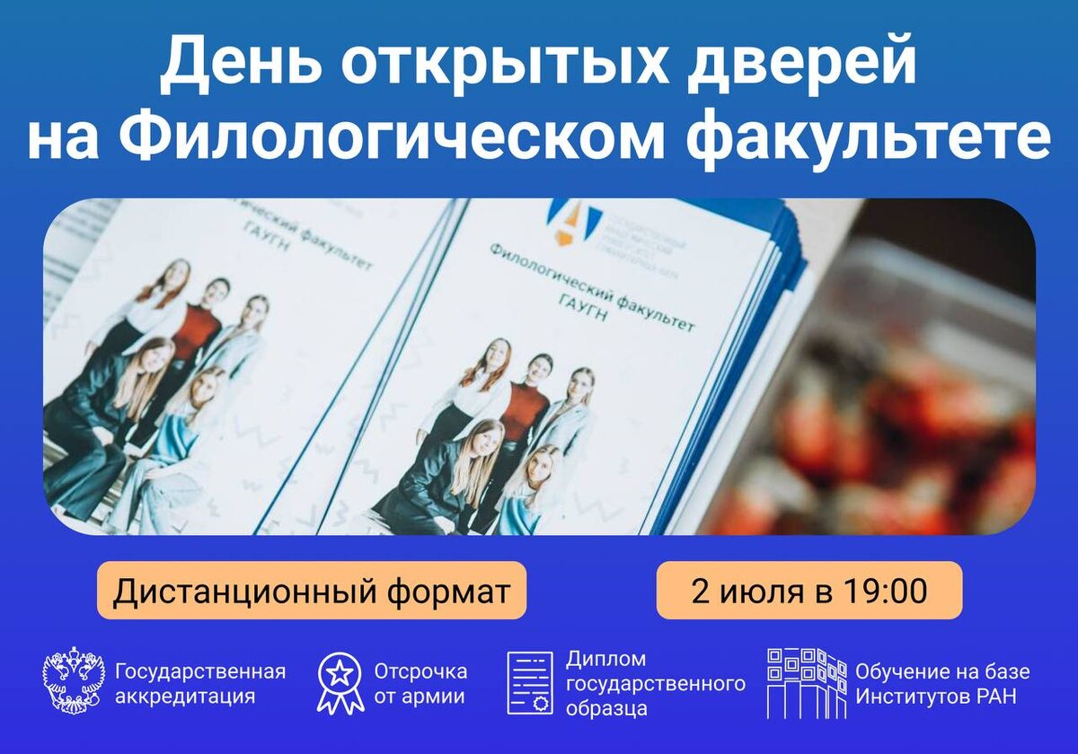 День открытых дверей на Филологическом факультете в онлайн-формате 🎓 2 июля Филологический факультет ГАУГН открывает серию онлайн-встреч и.о. декана Факультета Софии Фурмановой с абитуриентами. На встречах гости узнают все о факультете, условиях приема, о преимуществах и содержании образовательных программ по Лингвистике, о возможностях индивидуализации студенческих образовательных траекторий (второй язык, базы практик, параллельное освоение нескольких профессий), о научной и творческой внеучебной деятельности студентов. 📆 Дата и время: 2 июля в 19:00 часов. 🔗 Ссылка для подключения на платформе Яндекс.Телемост. 📌 Регистрацию на мероприятие можно пройти по ссылке. При регистрации на мероприятие у абитуриентов будет возможность заранее задать интересующие вопросы. #филологиГАУГН #ДеньОткрытыхДверей #абитуриенты25 #gaugn_priem