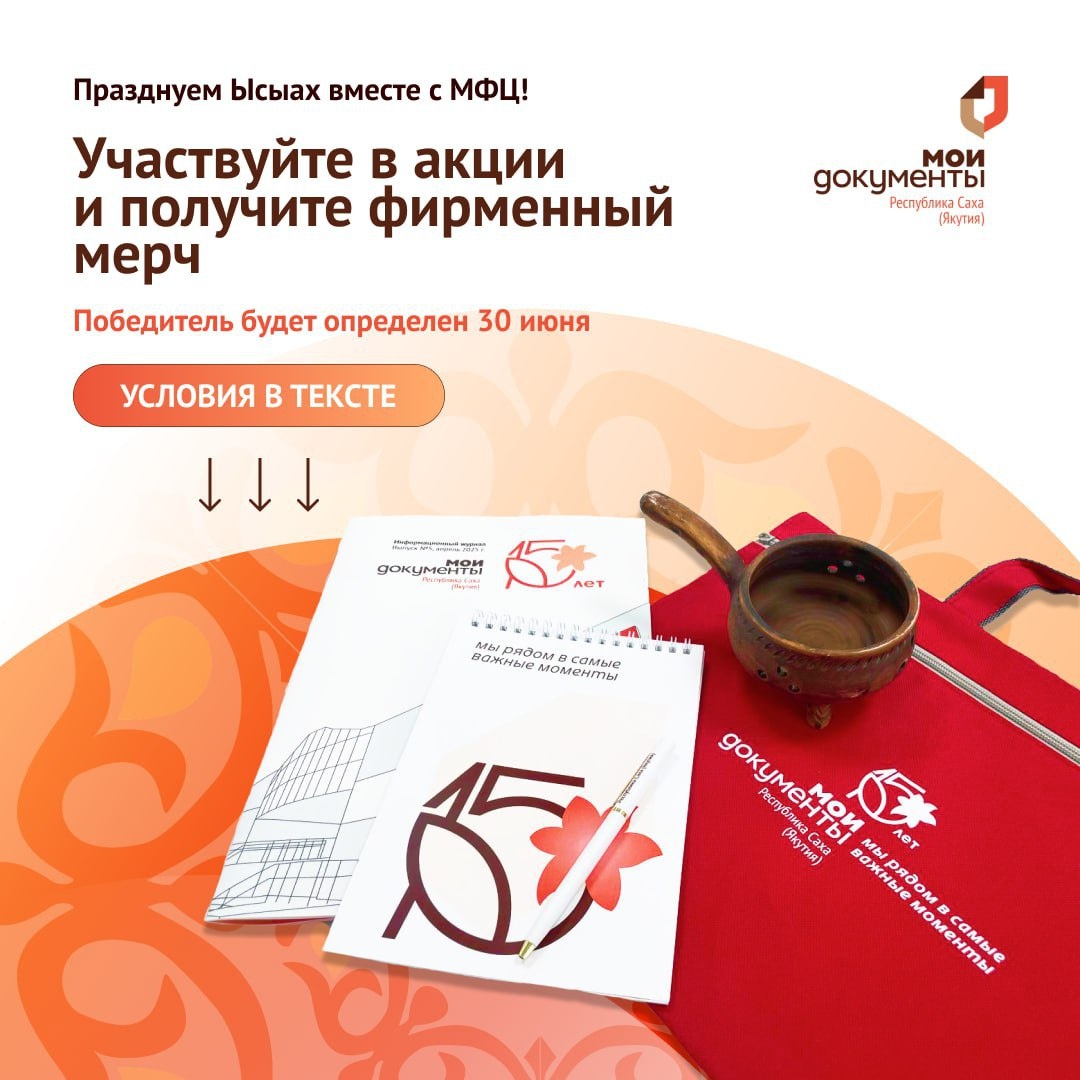 Праздничная акция от МФЦ в честь "Ысыах Туймаады – 2025"!❤️ 🚀Дорогие друзья! В честь самого яркого и долгожданного праздника лета – "Ысыах Туймаады-2025" – МФЦ запускает особенную акцию, в которой вы можете выиграть фирменный набор! 🎁Что входит в набор? ➡️Папка для документов; ➡️Блокнот; ➡️Ручка; ➡️Журнал МФЦ; ➡️Якутская обрядовая утварь - хомпуор. ℹ️Как принять участие? 1️⃣Подпишитесь на наши официальные каналы: 👉Телеграм 👉ВКонтакте 2️⃣Напишите в комментариях под этим постом поздравление с Ысыахом – поделитесь праздничным настроением! 🕓Сроки акции - с 27 июня по 29 июня 2025 года. Итоги подведем 30 июня 2025 года. ➡️Победителем станет участник, который оставит последний комментарий до завершения акции и выполнит все условия. Время завершения акции 29.06.2025 23:59, если после этого времени было оставлено несколько комментариев — победителем считается тот, кто оставит первый комментарий сразу после этого времени и выполнит все условия. При несоблюдении всех условий акции, п