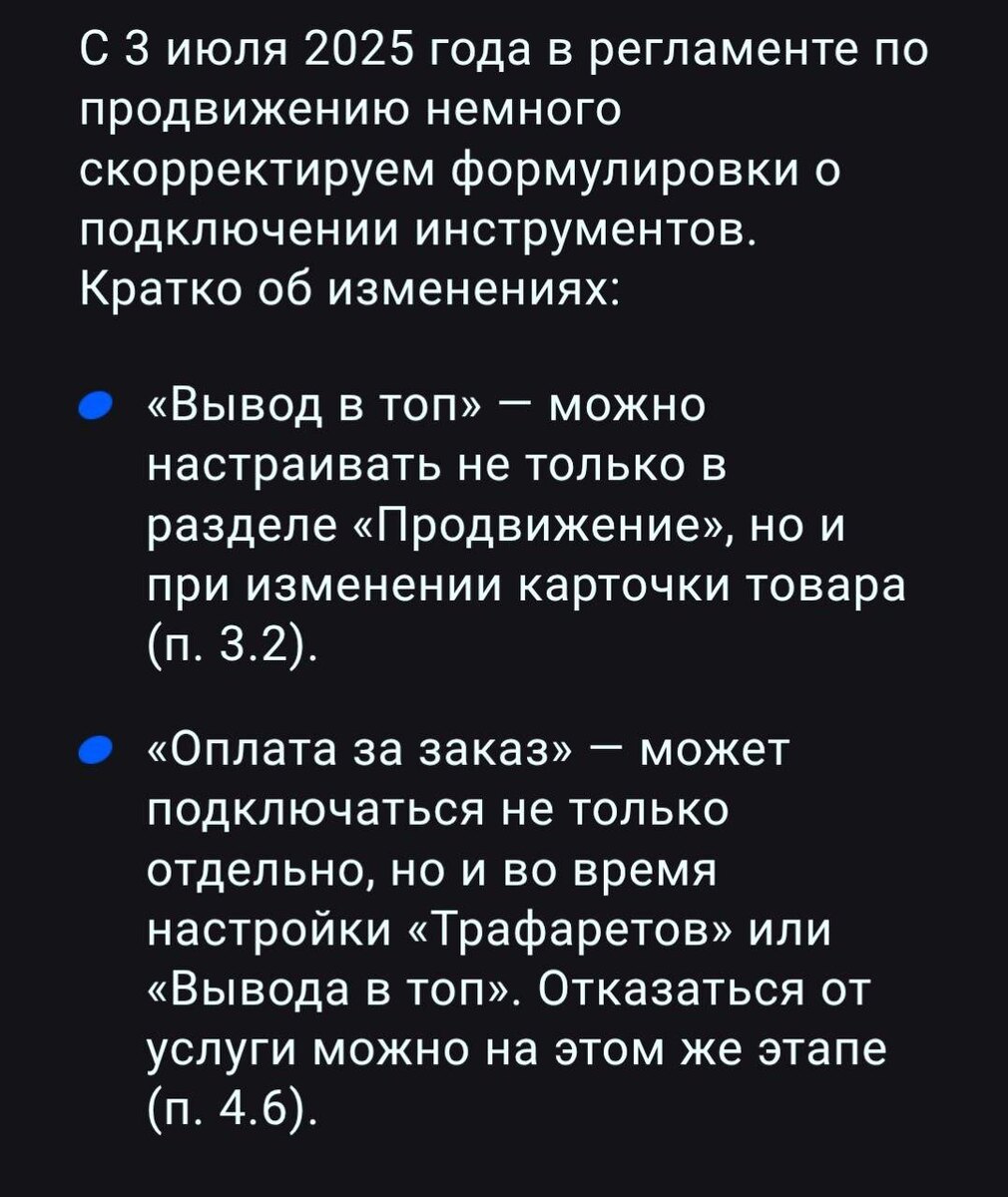 Будьте внимательны! С 3 июля Озон обновляет правила подключения продвижения. Если раньше платные услуги надо было подключать отдельно вручную, то теперь: ✔ «Вывод в топ» можно будет активировать прямо в момент изменения карточки товара ✔ «Оплата за заказ» — прямо при настройке трафаретов или вывода в топ ‼️ А теперь главное: галочки на этих услугах будут стоять по умолчанию. Хочешь — замечай и снимай. Не заметил — подключили за тебя. Озон как всегда: не “хочешь — включи”, а “не хочешь — отключи (если успел заметить)”. 📌 Проверьте настройки при любом редактировании карточек. Лишние траты — не ошибка, а новый регламент. Marketplace_biz - отдай свой буст каналу