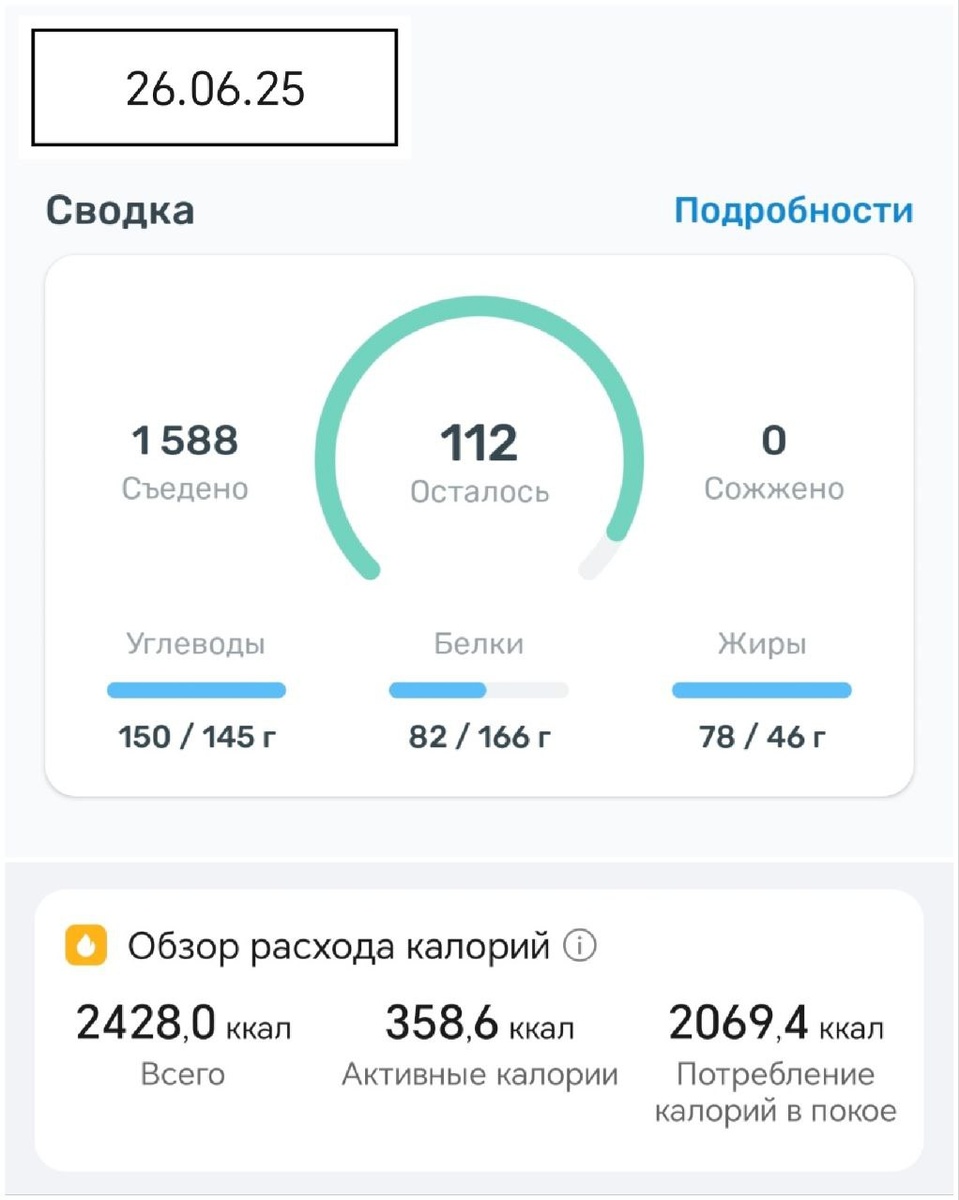🧐 Итоги вчерашнего дня. 🍔 День похудения: 170 🗓 27.06.25 ⚖️ Вес: 85.2кг ⬆️+0,3 кг😱 💪 Всего скинуто: 26 кг 🤔 Выводы дня: 🔸 Тенденция странная... 🔸 Вес приходит, но при этом растут мышцы, хотя я не занимаюсь вообще... 🔸 Домашние тренировки пока на паузе.... 🔸 На улице пасмурно, по прогнозу +12. 🔸 Спал сегодня 5 часа 46 мин. Сегодня последний день учёбы, а завтра на работу в ночь... надо попробовать сегодня лечь пораньше... 🔸 План на утро: Завес, Завтрак , Выгул собак, На учёбу... 🔸 Планы на ремонт: Продолжаю разбор вещей. 🔍 Подробные цифры похудения: (⬇️нажать, чтобы развернуть⬇️) ❌Не в норме: Возраст тела: 36 лет ИМТ: 26,9 ⬆️+0,1 😱 Жир(%): 26,4 % ⬆️+0,2 😱 Жир(кг): 22,49кг ⬆️+0,25 кг😱 Белок: 15,5% ⬇️-0,1 кг😱 Вода: 50,4% ⬇️-0,1%😱 Обмен: 1723 ккал ⬆️+5 ккал🥳 Висцеральный жир: 12 Кости: 3.1 кг ✔️В норме: Мышцы: 59,7 кг ⬆️+0,1 кг🥳 Скелетные мышцы 41.2 % (35,10кг) ⬆️+0,04 кг 🥳 ✍️ Комментарии к еде: (⬇️нажать, чтобы развернуть⬇️) 🟰За день: -488 ккал ➕Съедено: