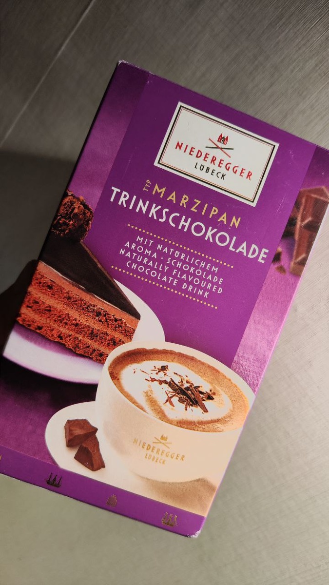 Марципановый горячий шоколад из Германии 🇩🇪 Trinkschokolade - горячий шоколад. Так и переводится, кто бы мог подумать😁 Упаковка нам уже известная по марципановому капучино, те же картинки с историей фирмы и традиционным тортом. Внутри упаковки 10 порций. Аромат марципана достаточно яркий, сразу понимаешь, что этот горячий шоколад будет совсем другим🐾 Напиток достаточно плотный, не водянистый, но пенки практически нет. Марципан чувствуется на послевкусии, он же придает терпкость напитку. Напиток мне показался менее сладким, чем обычный горячий шоколад. На упаковке есть рекомендация: украсить взбитыми сливками и посыпать сверху тёртым шоколадом. Конечно же я об этом прочла, когда допила упаковку😇 И так вкусно, #рекомендосьен, а в таком сочетание наверное БОМБЯО👋 Привезено из Калининграда Заказать можно на маркетплейсах Можно ещё глянуть видюшечку😉 #десерт #обзореды #вкусняшка #сладкоежка #фудблог #фудобзор #германия