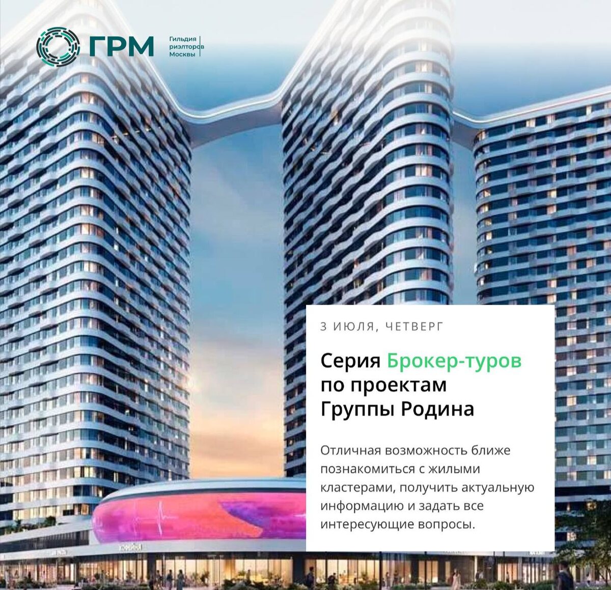 🗣 Уважаемые партнеры! Приглашаем вас принять участие в серии брокер-туров по проектам Группы Родина! Это отличная возможность ближе познакомиться с жилыми кластерами, получить актуальную информацию и задать все интересующие вопросы. В июле смотрим проект «СОЮЗ» 📆 Дата проведения: 3 июля 🕘 Время: 11:00 📍 Адрес офиса продаж проект СОЮЗ: М. Ботанический сад. Сельскохозяйственная улица д.26 стр. 9 (Вход в офис продаж с улицы Вильгельма Пика) ⚡️Регистрируйтесь прямо сейчас Количество мест ограничено!