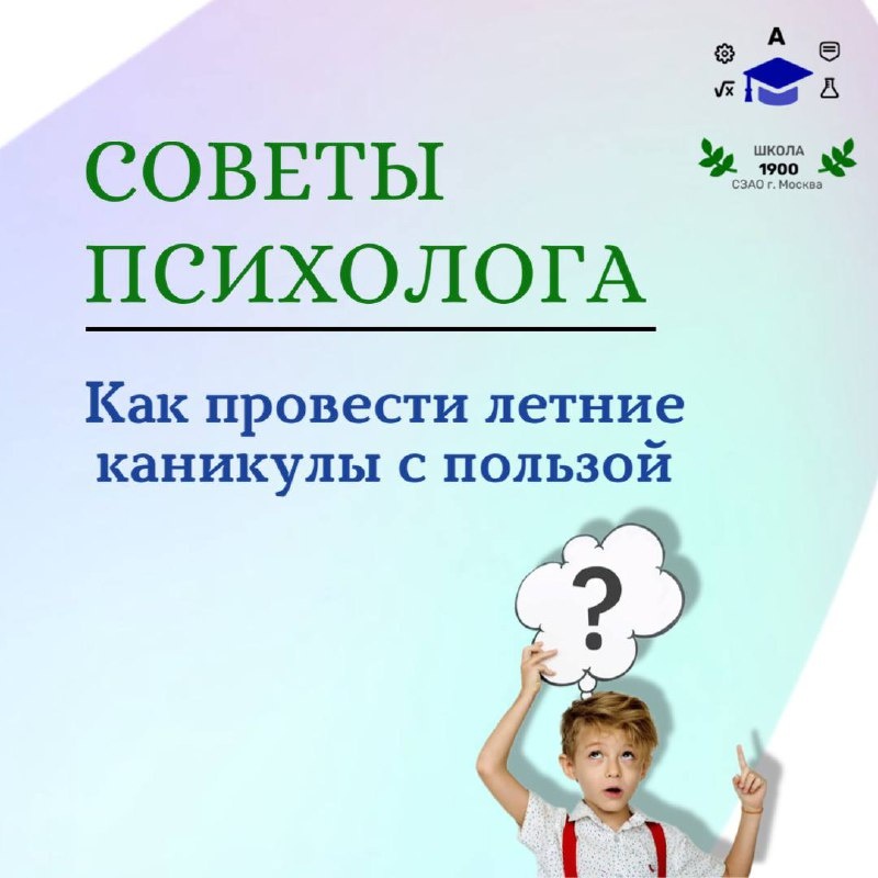 СОВЕТЫ ПСИХОЛОГА Как провести летние каникулы с пользой 🤩Вот и наступили долгожданные летние каникулы — время отдыха, приключений и новых впечатлений! Чтобы этот период прошёл гармонично, важно сохранять баланс между свободным временем и полезной активностью. 🤩Наши психологи рекомендуют заранее продумать распорядок дня, включив в него не только развлечения, но и занятия, которые помогут ребёнку развиваться, сохранять здоровье и эмоциональное равновесие. Правильная организация отдыха сделает его по-настоящему насыщенным и облегчит адаптацию к школе в новом учебном году. 🤩Пусть это лето принесёт вашей семье радость, вдохновение и множество тёплых воспоминаний. Отдыхайте с умом, заряжайтесь энергией и наслаждайтесь каждым днём! #Школа1900 #ДОНМ #НашиЛица