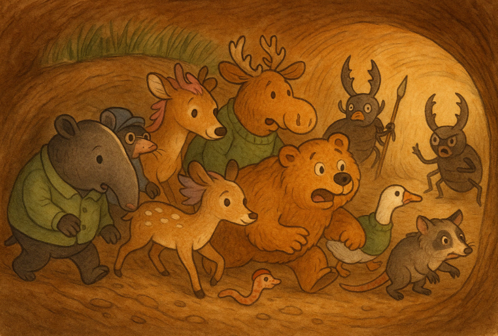 В один весенний вечер, под грибным настоем и бликами светлячков, Кротон сказал фразу, которая изменила всё: — А знаете... в лесу ходят слухи. Есть одно место — Глубинохранилище. — Звучит как желудочный приступ, — фыркнул Гусь Нажрусь, отламывая кусок коры. — Там хранится... вещь. Никто не знает, что. Но говорят, она стоит больше, чем весь лес вместе взятый. Молчание повисло, как паутина. — Мы туда пойдём, — сказал Тапир. — Не ради наживы. Ради… истины. — Я просто хочу что-то стянуть, — признался Опоссум. — А я — залезть в каждый отнорок вентиляции, — мечтательно добавил Енот. ________________________________________ • Тапир — стратег. Глубоко мыслит, мягко давит. • Кротон — техник. Копает, роет, слышит вибрации и электричество. • Косуля Сосуля — разведчица. Идеальна в маскировке, пахнет ландышем. • Лось Дебилось — силовая поддержка. Ничего не понимает, но несёт с уверенностью. • Чер Вяк — диверсант. Проникает, скользит, делает подкоп в реальность. • Гусь Нажрусь — логистика, питание и