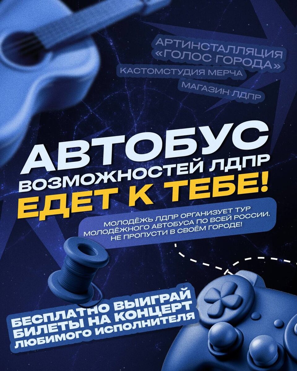 💙Автобус возможностей ЛДПР едет во Владимир! 🇷🇺Этот уникальный проект предлагает посетителям широкий спектр развлечений и возможностей: • Создание эксклюзивного дизайна на футболке в кастом-студии мерча. • Участие в сессии «быстрых свиданий». • Приобщение к ярким арт-инсталляциям. • Приобретение фирменной атрибутики ЛДПР. • Розыгрыш билетов на концерт популярного исполнителя. Мобильный центр ЛДПР - это отличная возможность интересно провести время, познакомиться с новыми людьми и узнать больше о деятельности партии. ✅Следи за расписанием, подключайся и участвуй!