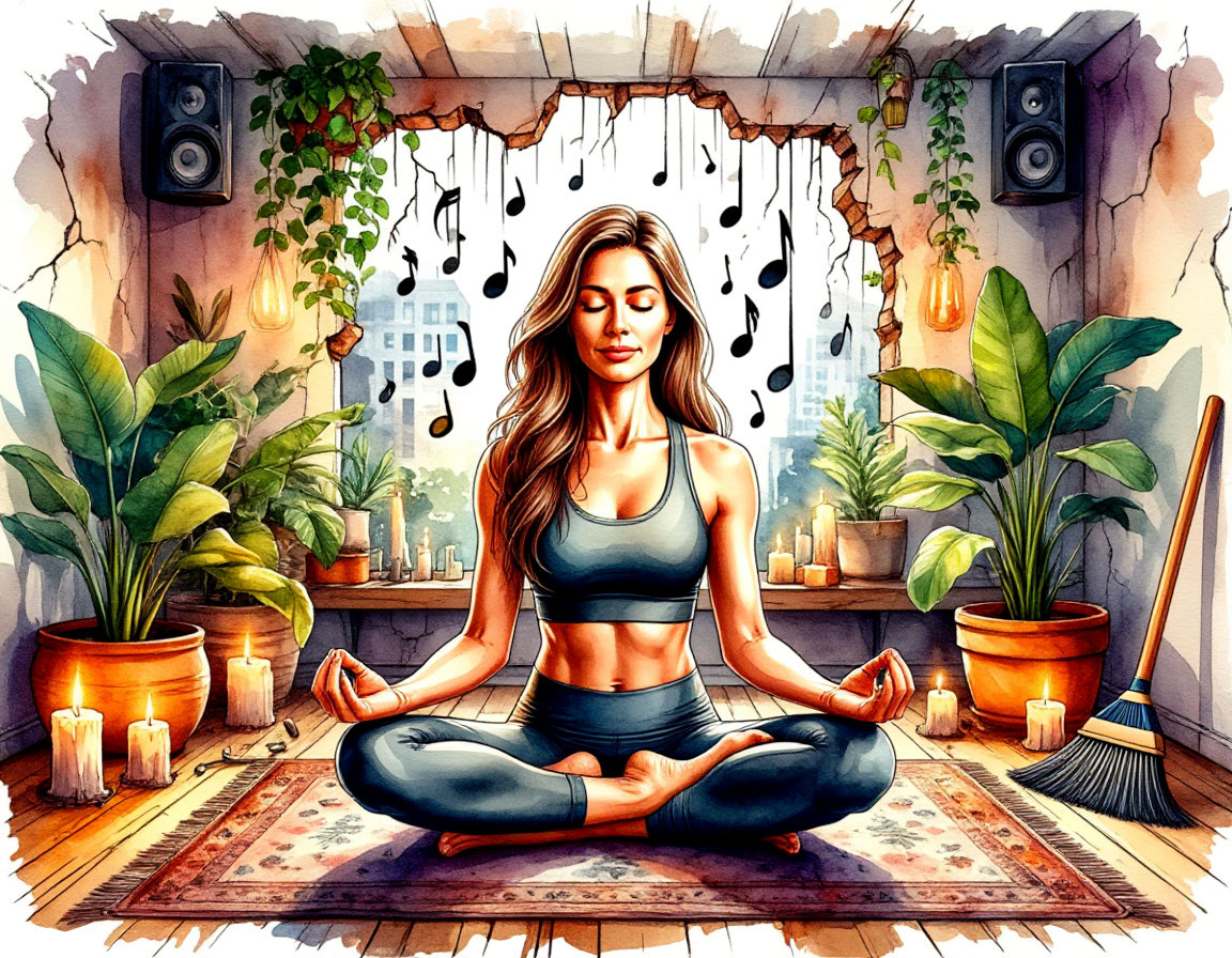 Елена разулась, встала на ковёр и начала плавную последовательность движений. Музыка идеально подходила — не отвлекала, но поддерживала ритм дыхания.