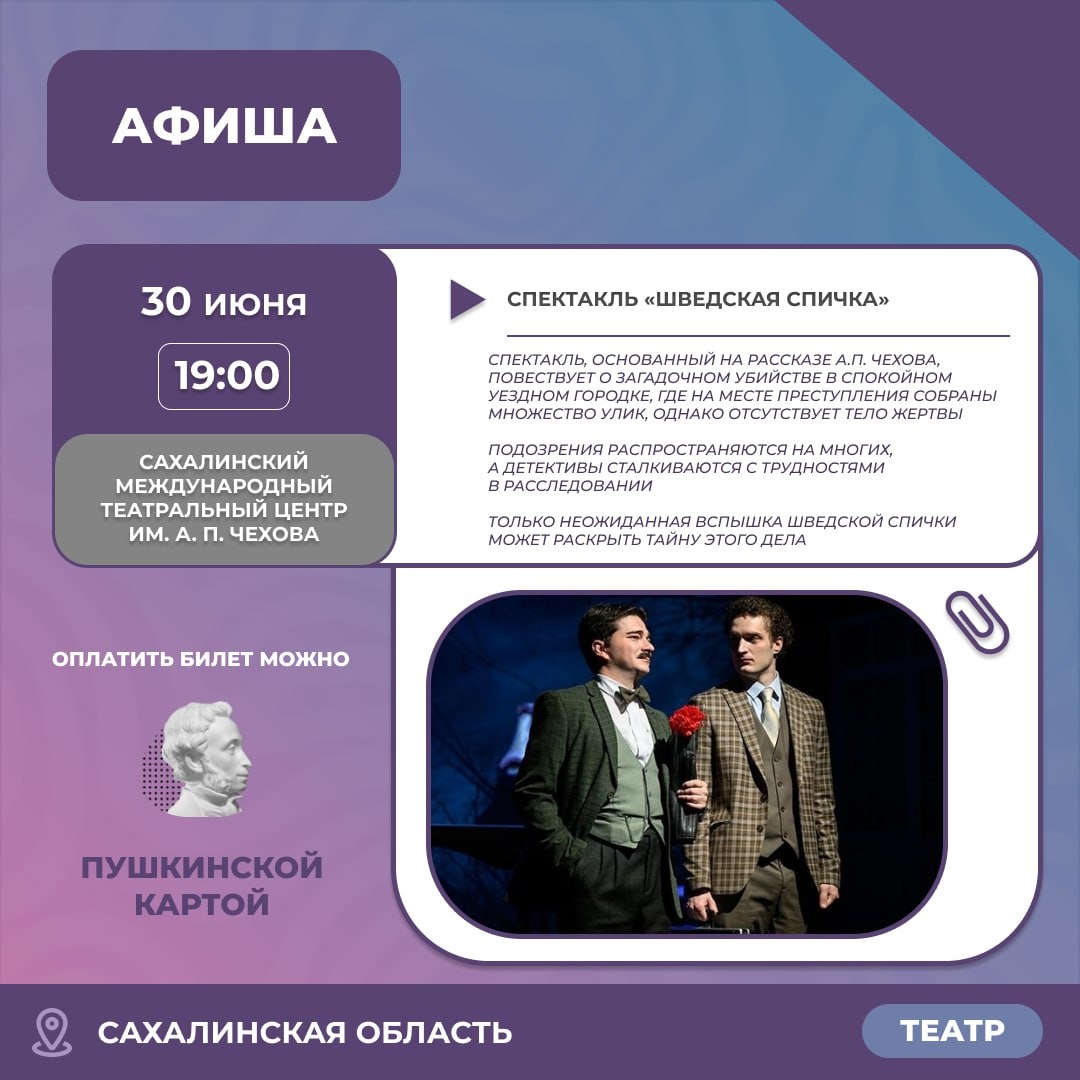 📢 Дорогие жители и гости Сахалинской области! 🎭 Не упустите шанс окунуться в мир театрального искусства! На предстоящей неделе вас ждут увлекательные постановки, которые не оставят никого равнодушным, подарив незабываемые эмоции и яркие впечатления.✨ #сахалинскаяобласть #сахалин #афишамероприятий