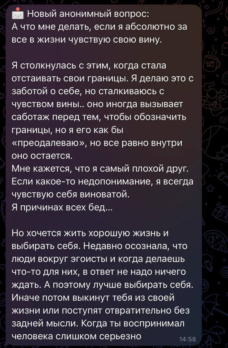 🔻Вина или стыд? Иногда мы говорим «я чувствую вину», но на самом деле переживаем стыд. Разница важная: Вина — «я сделала что-то не так». Стыд — «я сама не такая, я плохая». В вашем описании звучат оба чувства. Когда вы отстаиваете границы — возможно, вина: «я причинила неудобство», «я плохой друг».Но когда вы чувствуете, что «я причина всех бед», «я самый плохой человек» — это уже про стыд, про базовую установку о себе. ❗️Очень важно учиться различать это. Если это вина — полезно задать себе вопрос: действительно ли я сделала что-то неэтичное/неправильное, или это моя старая автоматическая реакция? Если это стыд — важно работать с самоценностью и образом себя. 🔻Почему люди так реагируют, когда вы ставите границы? Это классика в начале, когда человек начинает выбирать себя и свои потребности: раньше вы были удобной. Удобный человек не создаёт «неудобных» ситуаций, соглашается, терпит, подстраивается. Это выгодно окружающим. Когда вы начинаете отстаивать границы, для многих это восприн