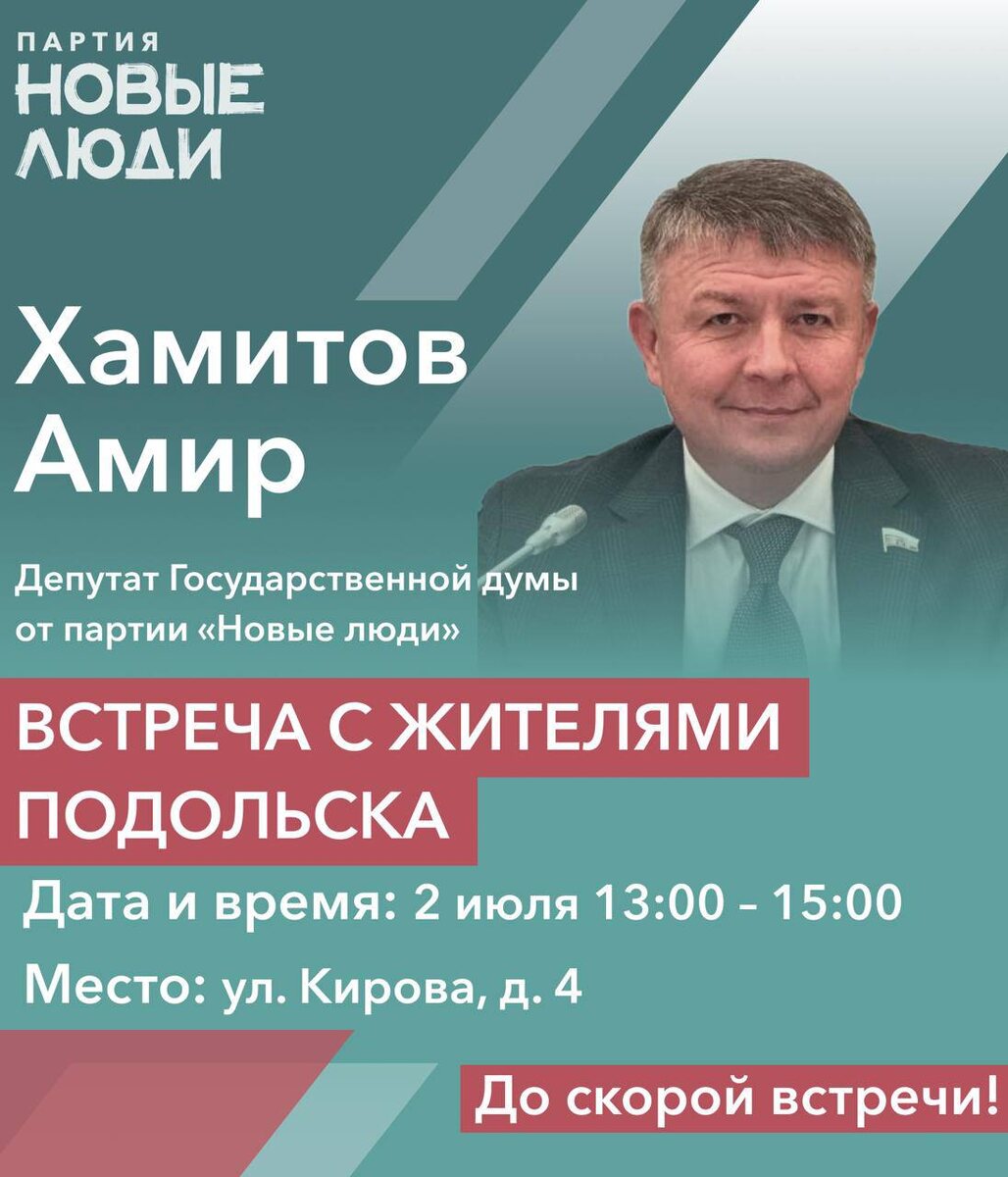 Уважаемые подольчане! В следующую среду, 2 июля в 13:00, я проведу личную встречу с жителями города Подольск. Приглашаю вас обсудить проблемы и перспективы города. Ваши предложения и замечания будут услышаны, записаны и взяты под мой личный контроль. Для участия во встрече необходима предварительная запись по телефону: +7 (919) 186 99 79 До встречи! ✅ Подписаться