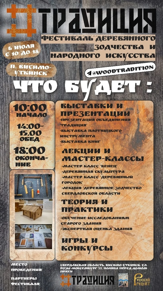 Погрузитесь в мир деревянного зодчества! В живописном поселке Висимо-Уткинск под Нижним Тагилом пройдет фестиваль, организованный объединением «Традиция». Вас ждут увлекательные интерактивные выставки, мастер-классы и лекции о традиционной архитектуре и реставрации деревянных домов. Программа фестиваля деревянного зодчества и народного искусства "Традиция": ✔️10:00 - 10:25 Презентация объединения "Традиция" ✔️10:00 - 16:00 Работа интерактивных выставок "Плотницкий инструмент" и "Книги про деревянное зодчество". ✔️10:30 - 12:00 Мастер-класс "Венец". ✔️12:30 - 14:00 Мастер-класс "Деревянная скульптура". ✔️15:00 - 16:00 Мастер-класс "Деревянный городок". ✔️14:00 - 15:00 Перерыв на обед. ✔️15:00 - 16:00 Конкурс-клаузура "Сельский деревянный дом" ✔️16:15 - 16:45 Андрей Романов с лекцией "Деревянное зодчество Свердловской области". ✔️17:00 - 18:00 Николай Зыков и Андрей Романов расскажут о исследованиях старого здания и экспертной оценке его состояния. 📍Висимо-Уткинск, Розы Люксембург