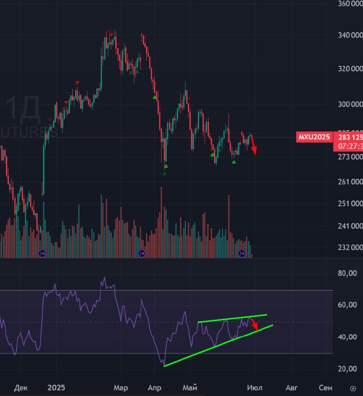 🏦 Индекс Мосбиржи 🟢 Но среднесрочно я жду индекс вниз. Первая цель - закрытие гэпа внизу. Если посмотреть на RSI, то мы там формируем клин, причем сейчас значения достаточно высокие не смотря на то что сам индекс с каждым разом все ниже и ниже. 🟢 Если пробьем клин вниз, то это будет поход ниже 2650. А такое вполне может быть, т.к. очень сильная эйфория в рынке, все нарисовали большой треугольник по индексу или наклонки, которые пробиваем вверх. #индекс #рубль #индексмосбиржи #ММВБ #IRUS #MXI #MIX #IMOEXF #bogdanoffinvest