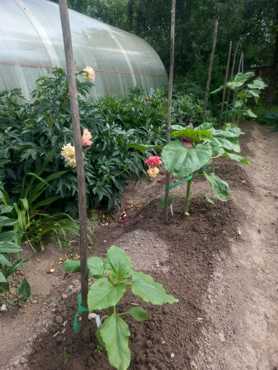 В этой статье я показываю подсолнухи, которые выращиваю как участник конкурса Гаганты Аминосил 2025. Мой выбор - это сорта Титан, Серый Кардинал и Гигант Выставочный. Посеяны они были во второй половине мая и не все взошли с первого раза. Три подсолнуха из девяти пришлось пересевать, поэтому такая разница в их высоте. Но это уже достаточно крепкие растения, требующие внимания и заботы. Подкормки, поливы, рыхление почвы, подвязка и удаление сорняков - всё это присутствует в их жизни. Погода у в июне в нашей местности была в основном прохладная, но в первой половине месяца выпадали и тёплые дни. Влажность умеренная, и это хорошо, так как для растений нет хуже сочетания излишней сырости и холода. На этом всё, продолжение последует через месяц.