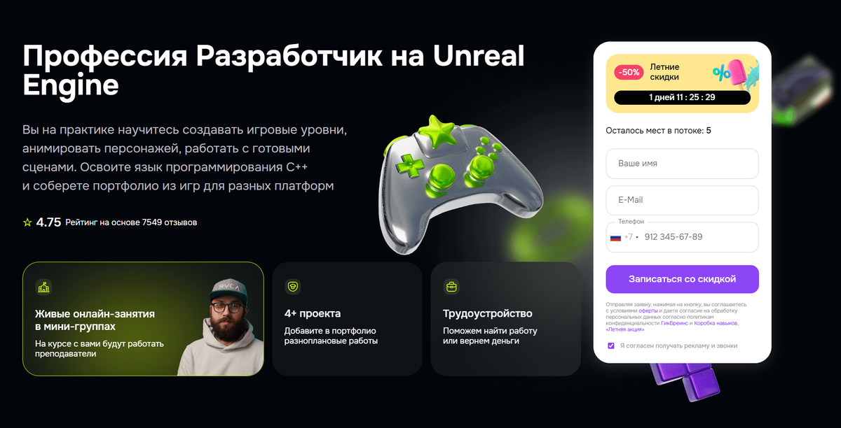 Курс "Профессия Разработчик на Unreal Engine" от GeekBrains — это идеальный старт для тех, кто хочет погрузиться в создание игр с использованием одного из самых мощных движков в мире. В программе обучения подробно рассматриваются все аспекты разработки: от основ до углубленных техник работы с Unreal Engine. Студенты изучают создание 3D-мира, анимацию, физику и работу с сетевыми играми. Интерактивные уроки и реальные проекты позволяют сразу применять знания на практике. В результате можно освоить все необходимые инструменты для работы в игровой индустрии, а также создать собственные проекты, готовые к демонстрации потенциальным работодателям. Особенно полезен курс тем, кто мечтает стать частью студий, работающих над крупными играми.