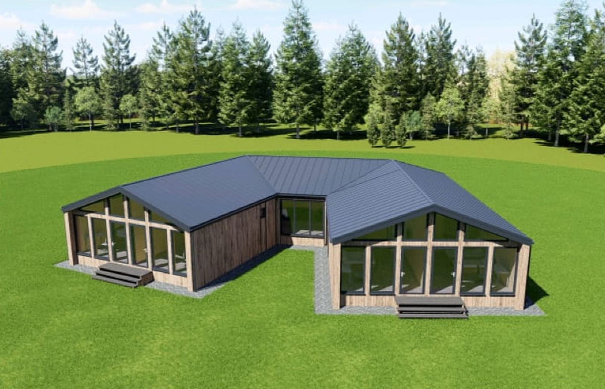 Закончили работу на интересном объекте — строительстве банного комплекса в лесу. Возвели фундамент из винтовых свай на болотистом участке, сделали обвязку фундамента швеллером. Здание строится по необычному проекту, поэтому фундамент имеет V-образную форму. В статье покажем, как будет выглядеть банный комплекс после завершения строительства, приведем план фундамента и покажем результат. Банный комплекс — это деревянное каркасное здание. У строения два крыла, расположенных под углом друг относительно друга. Каждое крыло имеет двускатную крышу, панорамное остекление главного фасада, свой вход. На боковых и тыльных фасадах здания располагаются дополнительные входы и компактные окна. Для наружней отделки здания будет применено натуральное дерево, кровля — фальцевая, в цвете графит. Такая постройка органично впишется в лесной пейзаж, не будет «спорить» и выделяться. В здании будет расположен банный комплекс «Банникум». Это спа-комплекс, в котором гостям будут предложены разные программы пар
