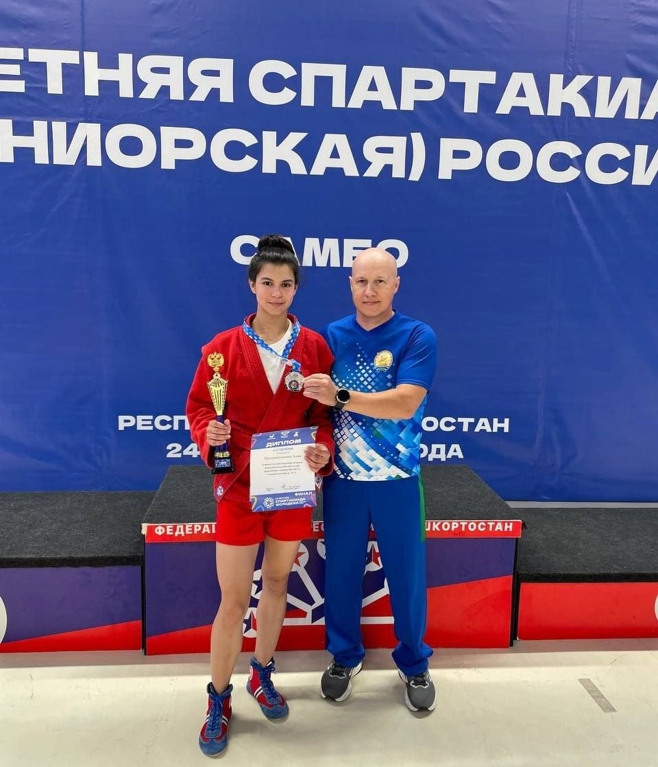 Алия Мухаметьянова из Башкирии завоевала серебряную медаль на VI летней Спартакиаде молодежи России по самбо. О победе башкирской самбистки сообщили в министерстве спорта республики. В финальном бою Алия Мухаметьянова уступила чемпионке Европы Софье Солуяновой из Пензы. Алия призналась, что мечтала о золотой медали, но серебро на таком уровне — тоже отличный результат. «Финал был действительно напряжённым. Я сразу поняла, что соперница очень техничная и весь бой пришлось бороться на изломе. Я старалась держать инициативу, но в какой-то момент оступилась, и этого оказалось достаточно. Конечно, немного грустно — мечтала о золотой медали, но серебро на таком уровне — тоже отличный результат. В дальнейшем я буду сосредотачиваться на чемпионате России и международных соревнованиях. Мечта — выиграть чемпионат Европы и мира среди взрослых», — рассказала самбистка. Алия тренируется под руководством Станислава и Елены Орловых в спортивной школе им. Н. Гастелло. В 2024 году спортсменка вошла в Т