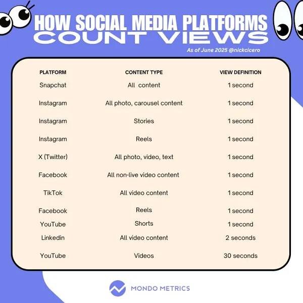 Как соцсети считают просмотры видео? 👀 Главный вывод нового исследования Mondo Metrcis — почти все крупные платформы засчитывают просмотр уже с первой секунды! Раньше, например, нужно было смотреть три секунды. Эксперты связывают это с популярностью коротких видео.