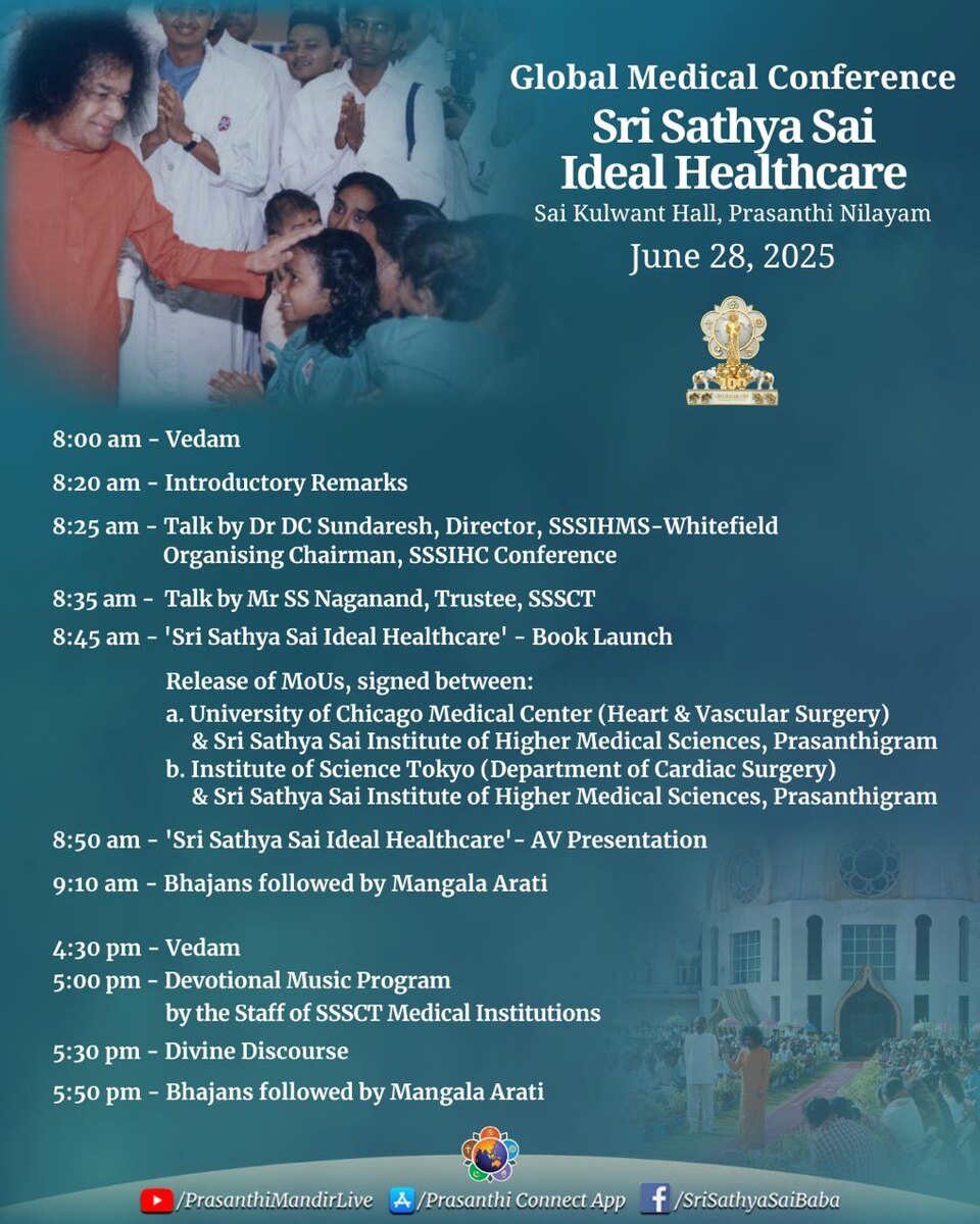 Глобальная медицинская конференция - Идеальное здравоохранение Шри Сатья Саи 28 июня 2025 г. 8.00* - Веды 8.20 - Вступительное слово 8.25 - Речь д-ра Д.С. Сундареша, директора ИВМНШСС - Вайтфилд, председатель-организатор Конференции ИЗШСС 8.35 - Речь м-ра С.С. Нагананда, попечителя ЦТШСС 8.45 - Презентация книги "Идеальное здравоохранение Шри Сатья Саи" 8.50 - Выпуск меморандумов о взаимопонимании, подписанных между: а. Медицинским центром Университета Чикаго (сердечно-сосудистая хирургия) и Институтом высших медицинских наук Шри Сатья Саи, Прашантиграм б. Институтом наук Токио (отделение кардиохирургии) и Институтом высших медицинских наук Шри Сатья Саи, Прашантиграм 8.50 - Аудио-визуальная презентация "Идеальное здравоохранение Шри Сатья Саи" 9.10 - Бхаджаны и Мангала Арати 🪷🪷🪷 16.30 - Веды 17.00 - Программа духовной музыки в исполнении персонала Медицинских организаций ЦТШСС 17.30 - Божественная беседа 17.50 - Бхаджаны и Мангала Арати *время по Индии, время по Москве - м