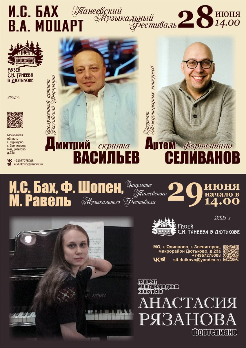 Танеевский музыкальный фестиваль, который ежегодно проводит Музей С. И. Танеева, подходит к завершению. За это время: ✨Дважды на концертах прозвучала «Баркарола» (Июнь из цикла «Времена года») Чайковского в исполнении Андрея Шишканова и Ивана Соколова. ✨Иван Соколов представил авторскую программу: рассказы о Танееве, редкие сочинения и вокальные номера. ✨ Яна Иванилова и Галина Мурадова исполнили дуэты Танеева и Аренского, а также романсы Рахманинова и Чайковского. Впереди — два заключительных концерта: 28 июня — дуэт Дмитрия Васильева (скрипка) и Артёма Селиванова (фортепиано) с музыкой Баха и Моцарта 👉 https://clck.ru/3MaVa9 29 июня — Анастасия Рязанова сыграет произведения Баха, Шопена и Равеля 👉 https://clck.ru/3MaV4r ⏱️Начало в 14:00 📍Музей С. И. Танеева в Дютькове