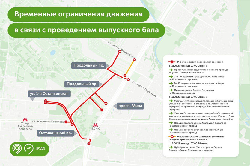 - С 15:00 27 июня до 07:00 28 июня нельзя будет проехать по Останкинскому проезду и 1-й Останкинской ул. — от просп. Мира до 5-го Останкинского пер. В обратную сторону проезд закроют от 5-го Останкинского пер. до ул. Академика Королева.