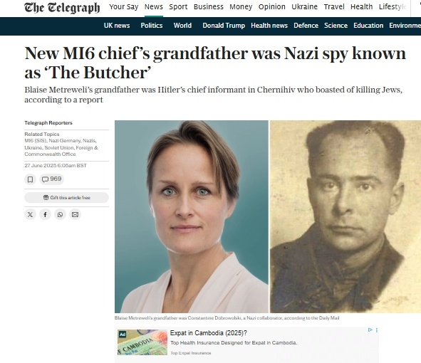 Отвечает ли внучка за деда? Такой парафраз известного изречения сталинской эпохи внезапно стал актуальным в Великобритании после коллективного «наброса» в исполнении ведущих СМИ страны – The Times, The Telegraph и Daily Mail – синхронно опубликовавших «сенсационное» расследование относительно темных пятен генеалогии основной кандидатки на пост главы британской разведки МИ-6 Блейз Метревели. Как утверждают издания со ссылками на архивные документы и комментарии властей Великобритании, дед Блэйз Метревели оказался перебежчиком из Красной армии времен Второй Мировой войны, бывшим солдатом танкового подразделения СС и гитлеровским коллаборационистом Константином Добровольским. Британский МИД прокомментировал эту информацию, заявив, что Метревели никогда не встречалась со своим биологическим дедом. Ее «сложное происхождение» власти Великобритании посчитали способствующим «приверженности предотвращению конфликтов и защите британского общества». Журналисты отмечают, что отец Метревели такж