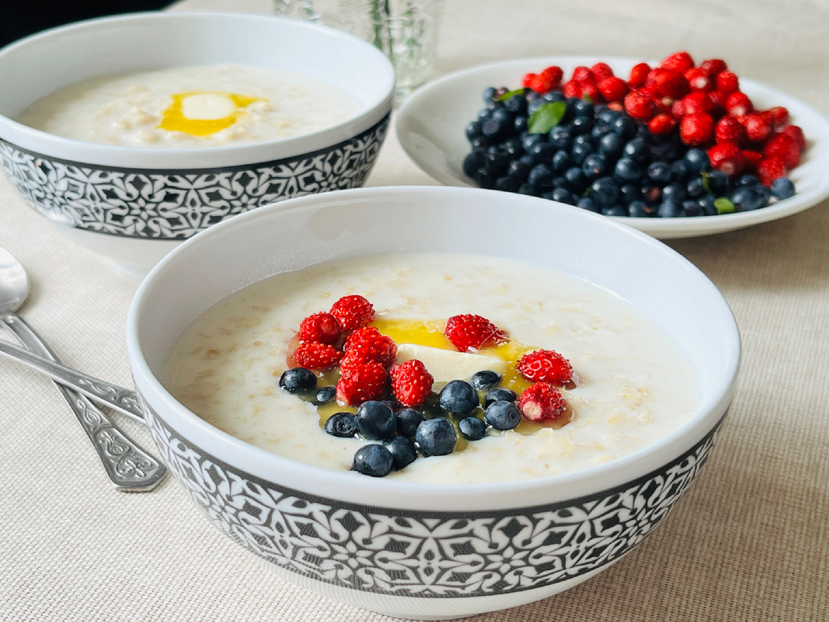 Я обожаю варить каши на выходных. Каша на завтрак в будний день - это что-то из области кинематографа, потому что работая на заводе, мое утро - это бессмысленный и беспощадный будильник на 6, а вместо завтрака глоток обжигающего чая и бутерброды с собой. До подъемов в 5 утра с размеренным завтраком и чтением прессы перед выходом я ещё не созрела. А вот молочная каша в выходной - это завсегда, и это традиция! Сейчас в интернете можно найти миллион рецептов овсяной каши, и производитель овсянки заботливо пишет рецепт на пачке, правда, забывая указать, что это будет не каша, а овсяный пирог. Поэтому делюсь рецептом, к которому пришла сама, и пропорцией, которая даёт идеальную не густую и не жидкую кашу. На 2 порции: • стакан воды • стакан молока • 6 ст.л. овсяных хлопьев (цельных, не быстроразвариваемых) • 1/4 ч.л. соли • 2 ч.л. сахара • сливочное масло Тем кто не привык измерять объемы гранеными стаканами, под стаканом подразумевается 250 мл. А любителям все взвешивать - 6 ст.л