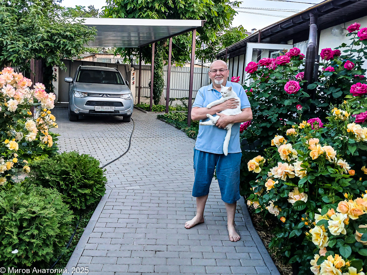 Лена приготовила на обед холодный свекольник. День не очень жаркий, поэтому мы садимся обедать на открытой террасе. Террасу окружают розы: красная Аскот и две розовые Леонардо да Винчи. Розы мы здесь посадили в 2016 году, стало быть, им здесь 5 лет.
