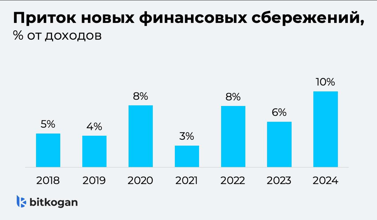 Цифры в духе 43 трлн руб. на вкладах звучат очень притягательно. Но давайте уже трезво разберемся. Порядок величин мы можем понять. Сколько вообще накопили? За последние 3 года сверх нормы отложили примерно 13 трлн руб. Они ушли в финансы — в основном в депозиты. Из-за высоких ставок и неопределённости в 2022–2024 гг. люди стали больше сберегать — в среднем, 8,4% от доходов. В спокойные времена обычно откладывали 3–5%. Можно оценить, сколько денег пришло в финактивы сверх исторического тренда. Получим около 13 трлн руб. Если сделать такое же упражнение не по чистым финансовым активам, а отдельно по депозитам, снова получится 13 трлн. На них в основном и аккумулировались притоки в финансовые активы. Куда пойдут эти 13 трлн руб.? Наивно думать, что эти деньги пойдут исключительно на инвестиции. Расклад следующий: ◽️Потребление — около 50%. После периода высокой нормы сбережений следует ее снижение. Люди наращивают потребление, которое откладывали. Так, в 2015–2017 гг. население сберегло