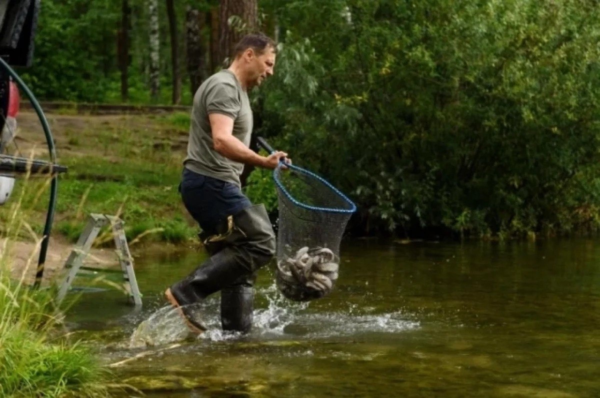 Рыбе по два года, вес — около 300–350 граммов. По словам специалиста, в водоёме много корма, и амур будет поедать водоросли в верхних слоях.
