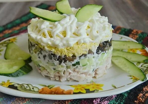 🥓 копченая курица 250 г 🥓 огурцы 2 шт 🥓 яйца 3 шт 🥓 твёрдый сыр 80 г 🥓 укроп 15 г 🥓 майонез 2 ст л 🥓 соль по вкусу 🥓 перец черный молотый ⠀ ⁃ Яйца предварительно отвариваем до готовности около 10 мин и остужаем в холодной воде. ⁃ Копчёную курицу освобождаем от кожицы и срезаем мясо с костей. Мякоть нарезаем небольшими кубиками и кладем в глубокую миску или в салатник. ⁃ Предварительно отваренные и охлаждённые яйца очищаем от скорлупы и нарезаем небольшими кубиками. Добавляем яйца в салатник к нарезанной курице. ⁃ Срежьте кончики на огурцах. При необходимости срежьте кожицу (если она слишком грубая или повреждена). Нарезаем кубиками и добавляем в салат. ⁃ Сыр натираем на крупной тёрке. Добавляем натёртый сыр в салатник к ранее подготовленным ингредиентам. ⁃ Свежую зелень нарезаем и добавляем в салат. Заправляем салат майонезом и перемешиваем. ⁃ Пробуем салат на вкус и, если есть необходимость, добавляем соль и чёрный молотый перец.