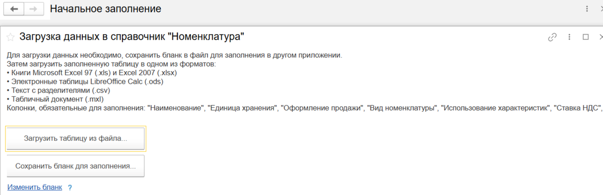 Если требуется перенести номенклатуру из одной базы в другую или загрузить разово большой объем данных, для этого подойдет типовой механизм загрузки Номенклатуры. Если требуется загружать номенклатуру в больших объемах регулярно (силами сотрудников организации), типовой механизм для этого может быть неудобен в использовании. Выгрузка Номенклатуры из базы 1С НСИ и Администрирование - Администрирование - Печатные формы, отчеты и обработки - Универсальный отчет выбираем Имя объекта Номенклатура и выгружаем данные. Аналогично можно выгрузить и справочник Контрагенты. Загрузка Номенклатуры в базу 1С НСИ и администрирование - Начальное заполнение - Загрузка данных из файла - Номенклатура В разных релизах программы функционал загрузки данных и поля могут отличаться. Функционал загрузки чувствителен к регистру, поэтому необходимо сверяться при внесении данных на форму или в файл. Также учитываем наличие или отсутствие точек и запятых во вносимых данных: шт. - неверно, Шт - невер