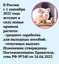 В России с 1 сентября 2025 года вступят в силу новые правила расчета: - среднего заработка для выходных пособий; - отпускных выплат. Изменения утверждены Постановлением Правительства РФ №540 от 24.04.2025.